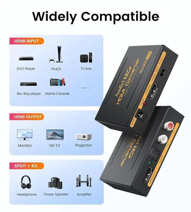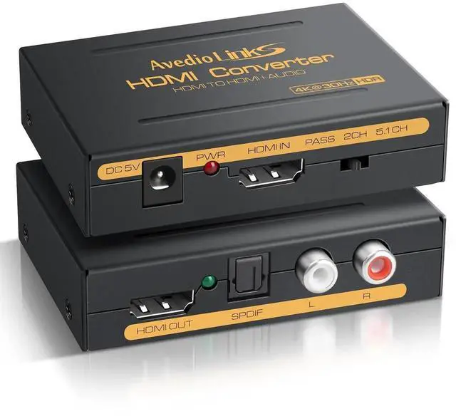 HDMI Audio Extractor: avedio links HDMI to optical audio adapter is designed to extract the digital audio embedded in HDMI source and output it via optical SPDIF or L/R stereo audio out. Original video/audio signal is also passed through to HDMI output. Then you will be able to send the splitted audio to an amplifier AV receiver soundbar or other sound systems.