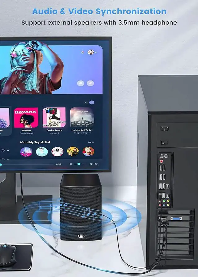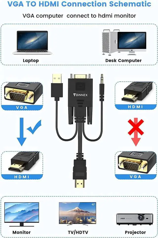 Only from VGA to HDMI HDMI to VGA will Not WorkFOINNEX 6FT/ 1.8M VGA to HDMI cable offers you a convenient way to connect PC old-styled laptops Notebook Desktop computer with VGA output to displays such as projector monitor TV or display screen with HDMI. VGA male to HDMI male cable. Easily Solve Problems with One CableVGA male to HDMI cable no need any extra hdmi cables and vga cables. BONUS a RCA Left/Right stereo audio to 3.5 mm AUX adapter cable to get audio signals from DVD TV-box and more devices with RCA output. Support Audio and Video Synchronizationvga output to hdmi input adapter cable supports video resolution up to 1920 x 1080/60Hz Supports 24-bit; VGA to HDMI adaptor / lead transmit stereo audio via male 3.5 mm AUX Mini Jack or 2 male RCA stereo audio plug.