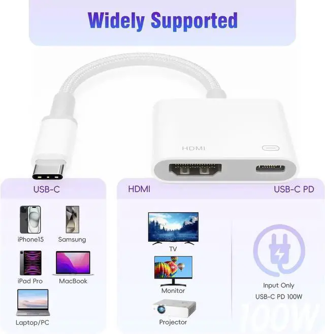 ![Alt view image 7 of 7 - JAENFONG USB C to HDMI Adapter for iPhone 15 to TV [MFi Certified] 2 in 1 Type C With 100W Fast Charge Digital AV 4K HDMI Converter for iPhone 15/15 Pro to HDTV Projector](https://c1.neweggimages.com/productimage/nb640/C280S25092404J3Y559.jpg)
