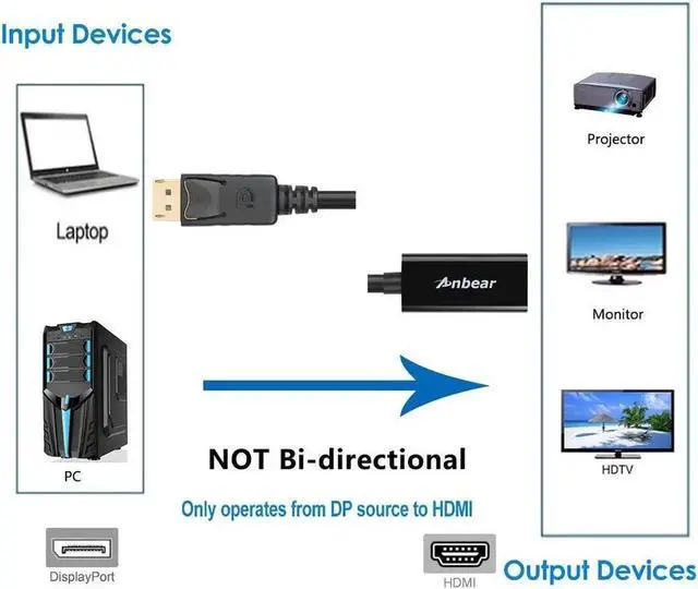 Portable adapter connects a DisplayPort (DP DP++ DisplayPort++) equipped laptop or desktop to an HDTV monitor or projector with HDMI input An HDMI cable (sold separately) is required. Transmits high-definition audio and video from your computer to an HDTV for video streaming or gaming Connect and configure your monitor for an Extended Desktop or Mirrored Displays. Supports video resolutions up to 1920x1200 / 1080P@60HZ /720P@60HZ (Full HD) and uncompressed digital 7.1 5.1 or 2 audio channels. DisplayPort connector with latches provides a secure connection with a release button that must be depressed before unplugging. Gold-plated connectors resist corrosion provide durability and improve the signal transmission.
