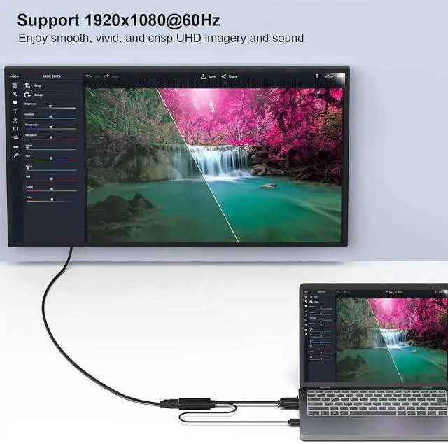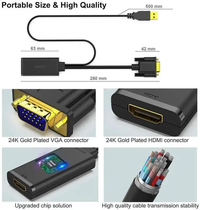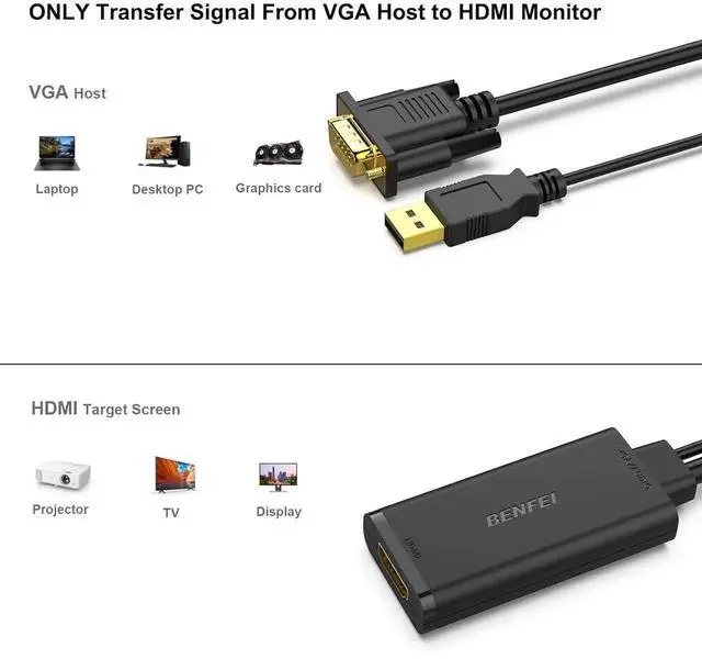 COMPACT DESIGN - The BENFEI compact-designed portable VGA to HDMI adapter connects a computer desktop laptop or other devices with VGA port to a monitor projector HDTV or other devices with HDMI port; Tuck this lightweight gadget into your bag or pocket to do a business presentation with your laptop and projector or extend your desktop screen to a monitor or TV; A HDMI cable is required. SUPERIOR STABILITY - Built-in advanced IC chip converts VGA analog signal to HDMI digital signal; It is NOT a bi-directional converter and cannot transmit signals from HDMI source to VGA monitor.