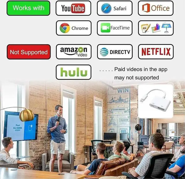 Just insert each interface to corresponding device click the C0XPTrustC0XP button when connecting and then wait a few seconds to connect automatically easy and quick to install saving your much time. Supported Applications This iPhone to HDMI adapter supports YouTube Hulu Plus IDMB Quickly Family On TV ABC NBC FOX and local videos. Due to HDCP copyright protection the lightning to hdmi adapter does not support paid videos such as Netflix/HBO GO/Affinity Player/Prime/Hulu/DIRECTV and other apps. Portable and User-friendly Design The pocket size lightning to hdmi adapter allow you to carry it everywhere. Watch your media or deliver your presentation on a bigger screen wherever it is most convenient.