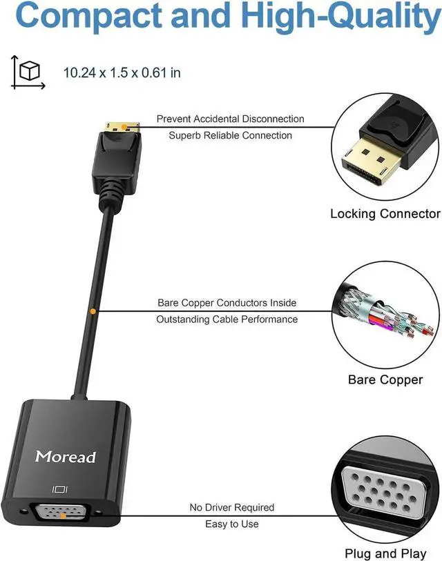 COMPACT DESIGN: The portable Moread DP to VGA adapter connects a desktop or laptop with DisplayPort (DP DisplayPort++ DP++) port to a monitor display projector or HDTV with VGA input; Tuck this lightweight gadget into your bag or pocket to make business presentation or extend your workspace to increase productivity; A VGA cable is required (sold separately)