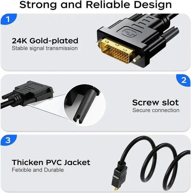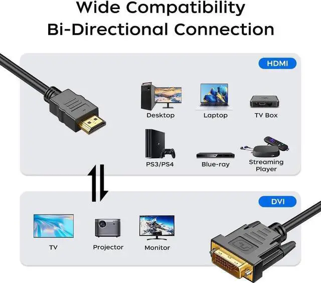 Note: Please select the correct signal source: DVI signal source or HDMI signal source incorrect signal source will cause the cable cannot work and the monitor cannot be displayed properly1080P HD resolution6 ft HDMI to DVI cable support up to 1080P HD resolution for LCD and LED monitor which can mirror or extend high quality video to a larger screen provide a excellent viewing experience or open a multitasking operation for work and play. Let's watch live sports events with some like-minded peopleStronger connector24K gold plated all-metal corrosion resistant connector ensures stable and fast signal transmission anti-electromagnetic interference can withstand multiple insertions; PVC jacket offers extra layer of protection and the hand-tightened screws provide secure DVI connectionPlug and playSimple operation just put into the HDMI Type-A port and DVI-D port can realize simultaneous transmission of video and audio ideal for Videos games and presentationsWide compatibilitySupport devices with HDMI port such as TV Laptop Blu-ray Desktop PC PS3 PS4 TV Box X-box 360 X-box One Wii U; Support with DVI-D equipped devices such as HDTV Monitor Projector