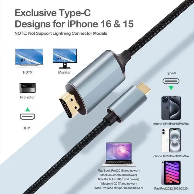 Lightning interface: iPhone14/13/ 12/12 Mini/12 Pro Max/11/11 Pro/XS/ XS Max/XR/X/8/8 P/7/7 P/6s/6s P/6/6 P/5s/5c/5/se iPad Pro 2018 etc. For lightning models please choose the other variation Lightning- 6.6 ft or search for ASIN B0CBRRVDKZ. [Effortlessly Connection] Connect your iPhone 16 to hdmi cable with TV directly no need extra HDMI Cable it is the perfect solution for seamless connectivity between your iPhone and TV projector or monitor. With a 6.6 ft length durable construction and compatibility with the latest iPhone models you can enjoy crystal-clear audio and high-definition video with ease. [High-Quality Display with USB C to HDMI Adapter] Delivers high-quality audio and video. With support for up to 4K HD resolution you can enjoy your favorite content in stunning detail. Plus our iPhone 15 HDMI cord to TV supports audio output so you can enjoy your music and movies with high-quality sound. [Uniqueness of HDMI Adapter] Our iPad to HDMI adapter for iPhone 15 and iPad Pro offers unique features that set it apart from the competition. With support for audio output and high-quality video up to 1080p HD resolution our iPad to HDMI and iPhone adapter HDMI offers a versatile and immersive streaming experience.