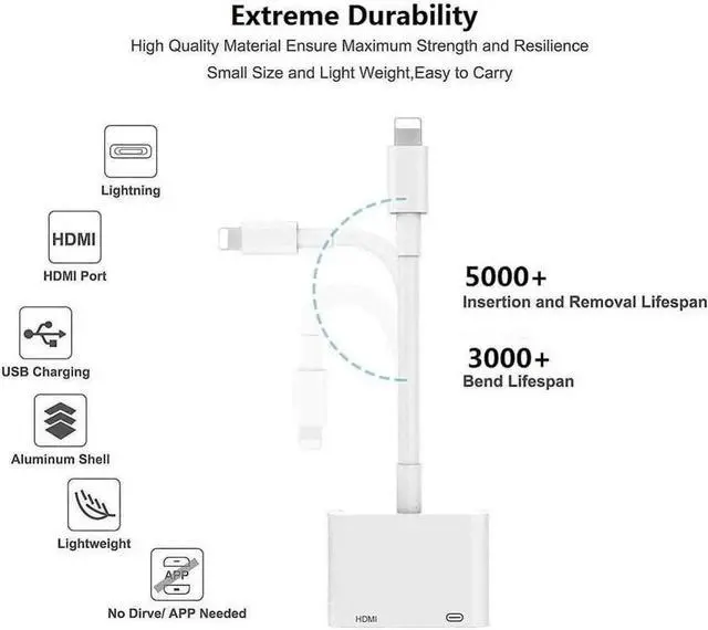 Please Note: This HDMI to Lightning Adapter Does Not support Netflix/HBO GO/Affinity Player/Prime/Hulu/DIRECTV and other Paid Videos in App. Durable and Portable Adopted lightweight but premium quality aluminum alloy shell which provides you a long-lasting portable Lightning to HDMI Converter. This HDMI adapter for iPhone has a compact and lightweight design which allows you to carry it in your bag everywhere. This tiny device will fit even in the smallest pocket and will always be with you when you need it.