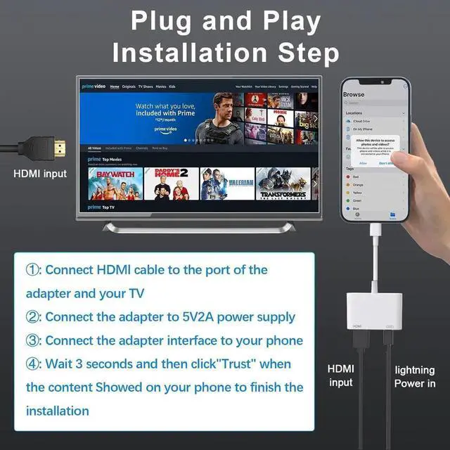 ?? Supported Applications This iPhone Lightning to HDMI adapter supports YouTube Hulu Plus IDMB Quickly Family On TV ABC NBC FOX and local videos. Due to HDCP copyright protection the iphone to hdmi adapter does not support paid videos such as Netflix/HBO GO/Affinity Player/Prime/Hulu/DIRECTV and other apps.??? Plug and Play No Power NeededNo setup neededsimply connect and go! There's no need to install any drivers or apps or to use personal hotspots or WiFi. Just connect the adapter to an HDMI cable (sold separately) and plug it into your TV. Wait for about 6-10 seconds then click the C0XPTrustC0XP button on your iPhone to establish an automatic connection.
