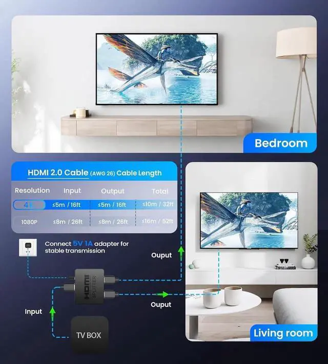 UHD 4K Resolution: This HDMI to HDMI splitter support high bandwidth 10.2 Gbps 3D 1080P and up to 4K resolution Suggest use AWG26 HDMI 2.0 cable for 1080p output input cable length 26ft output cable length 26ft; for 4K output input cable length 16ft output cable length 16ftWide