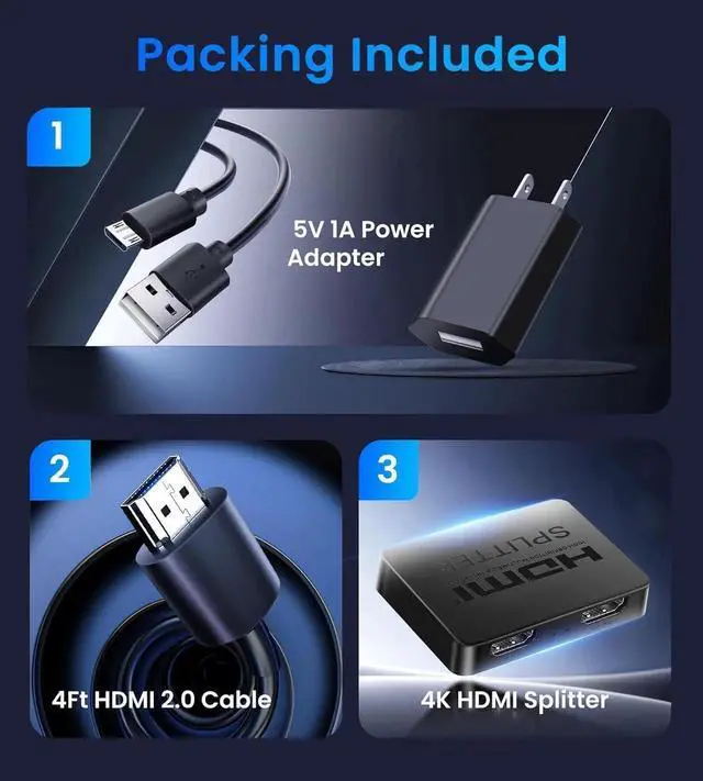 Package List: 1x 1 in 2 out HDMI splitter 1xUSB power cable with 5V 1A power adapter 1 x 4 Ft HDMI 2.0 cable 1x user manual; Ideal for both home and commercial applications such as multi-room home theater sharing synchronized gaming on two screens clothing store displays showroom demonstrations and office presentations.