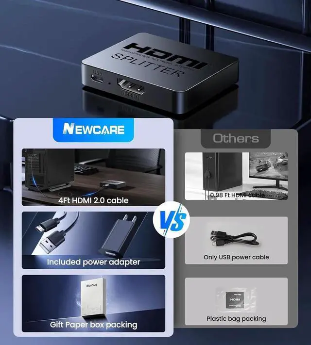Compatible: The NEWCARE HDMI 1 in 2 out splitter for TV support HDMI 1.3 / 1.4 HDCP 1.4 deep color 8/10/12 bit; support audio format including DTS-HD Dobly TrueHD LPCM 7.1 DTS Doby AC3 DSD and HD (HBR); HDMI input port is compatible with various HDMI devices like laptop PS3/4/5; The HDMI output ports work with HDMI-enabled displays like TVs monitors and projectors.