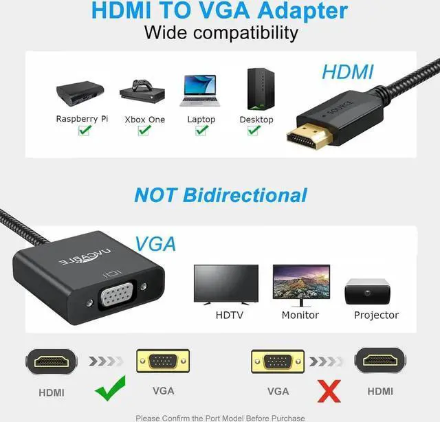 Wide Compatibility1. Built-in most advanced IC chip converts HDMI signal to VGA signal (MustComputer with HDMI and Monitor/TV/Projector With VGA) compatible with greater or equal 5V computer pc desktop laptop ultrabook notebook Chromebook. 2. Tuck this lightweight gadget into your bag to do a businNOT Compatible 1. It is NOT a bi-directional converter and cannot transmit signals from VGA to HDMI. 2. NOT compatible with Blu-ray player and devices with low-power HDMI ports such as SONY PS4 MacBook Pro with Retina Display Mac mini and TV for the low-power HDMI devices. High Video ResolutionSupports resolutions up to 1920x1080@60Hz (1080p Full HD) including 720p 1600x1200 1280x1024 for high definition monitors or projectors (Male HDMI to VGA).