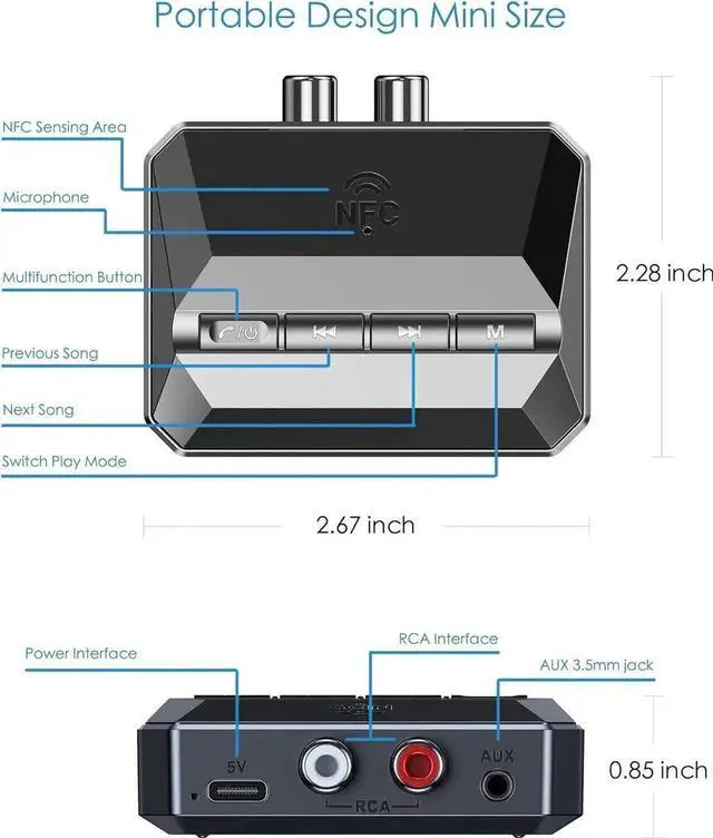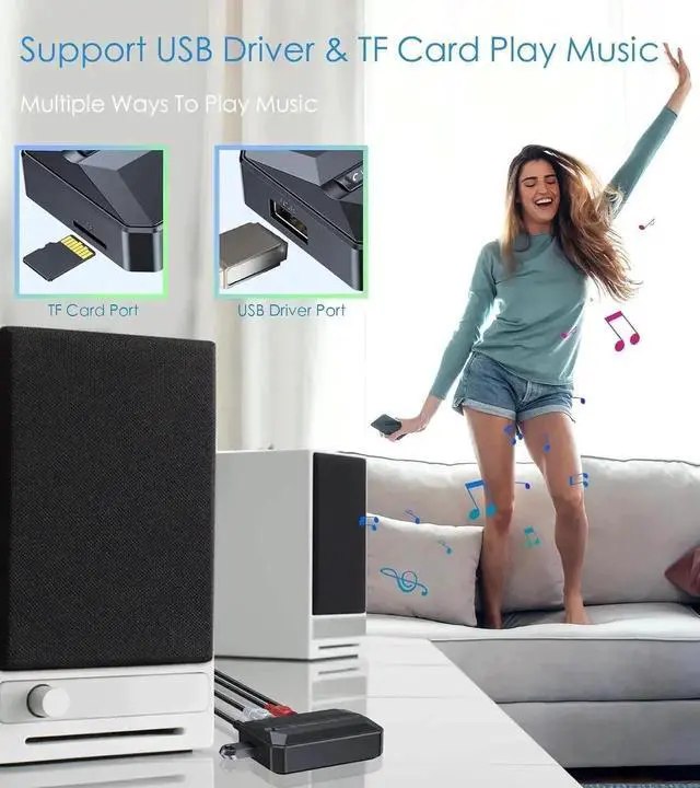 MULTIFUNCTIONAL INTERFACE: Supports RCA / 3.5 mm jack / NFC quick connect, and also supports a USB drive and TF card to play music. Which is compatible with 99% of speakers, old AV receivers, car stereos, and home stereos.