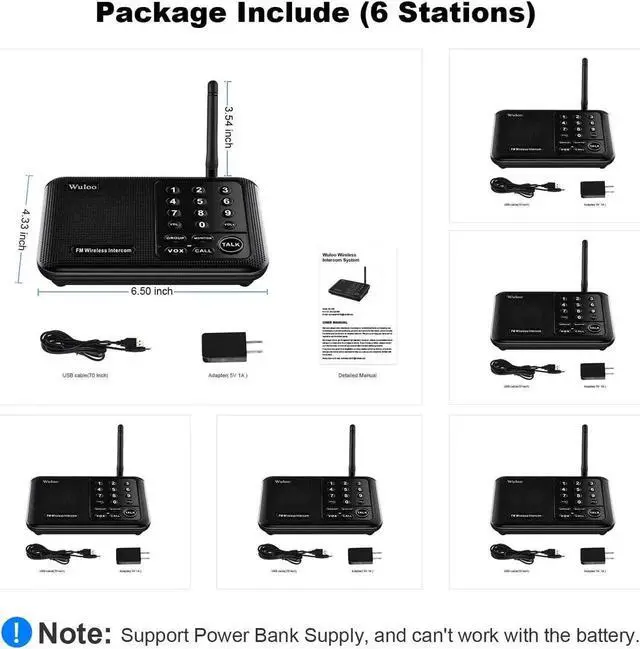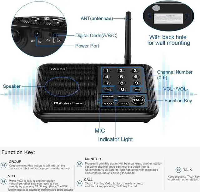 [Wuloo Brand] Wuloo are specialized in FM / ASK /FSK wireless techology for more than 20 years. Package equiped with quick start guide and detailed manual. false[ Easy to Use with Detailed Manual ] Features include Monitor, Talk, VOX (Voice Operated Exchange), Group, and Calling function. Increase/lower volume too! This intercom system is easier to use than others with user-friendly multi-functions and included step-by-step instructions! false[ Supported by Power Bank for Outdoor ] This device is compatible with Power Bank (5V 1A) making it easy to take these intercoms any place you want.