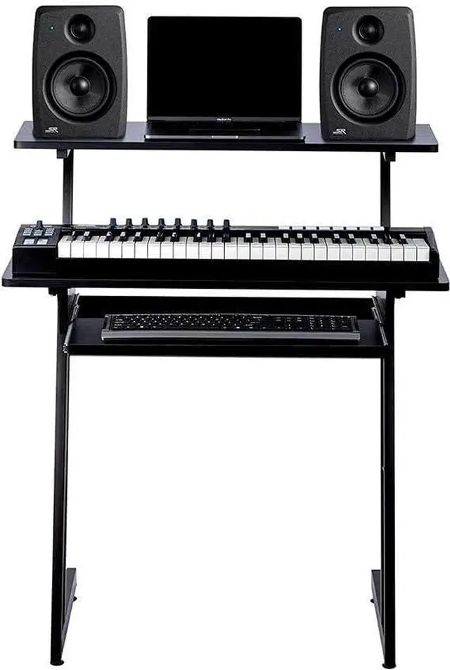 Building a home studio can be an exciting experience. It starts with sourcing core pieces of audio gear, such as Digital Audio Workstation software, an interface, good monitors, and so on. With the audio portion acquired, you are now ready to record, right? Not so fast. Usually neglected, a proper workstation can make the difference between an uncomfortably functioning home studio and one you actually want to work in. The Stage Right Recording Studio Desk brings the feel and comfort of a large professional studio directly into your home. Measuring only 31.5 in width, the Stage Right Recording Studio Desk is both large enough to fit a typical 49-key MIDI keyboard controller with full-size keys and small enough to fit into any room or apartment. At 24in of total depth and with an upper shelf that is 19in deep, it occupies the minimum amount of space possible. With a raised platform and pullout keyboard tray, the Stage Right Recording Studio Desk provides all of the flexibility necessary to accommodate most home studio setups. No monitor speakers stands? No problem.