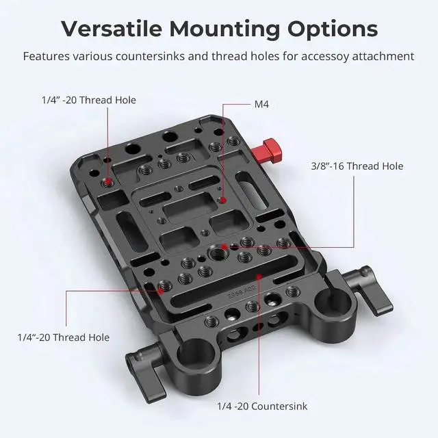 Versatile Mounting Options: The V-Mount Battery Plate includes multiple 1/4"-20 and M3/M4 countersinks, threaded holes, and an locating hole for ARRI, offering flexible mounting for dual rod clamps, magic arms, and other accessories. Build your ideal setup with ease. falseDual 15mm