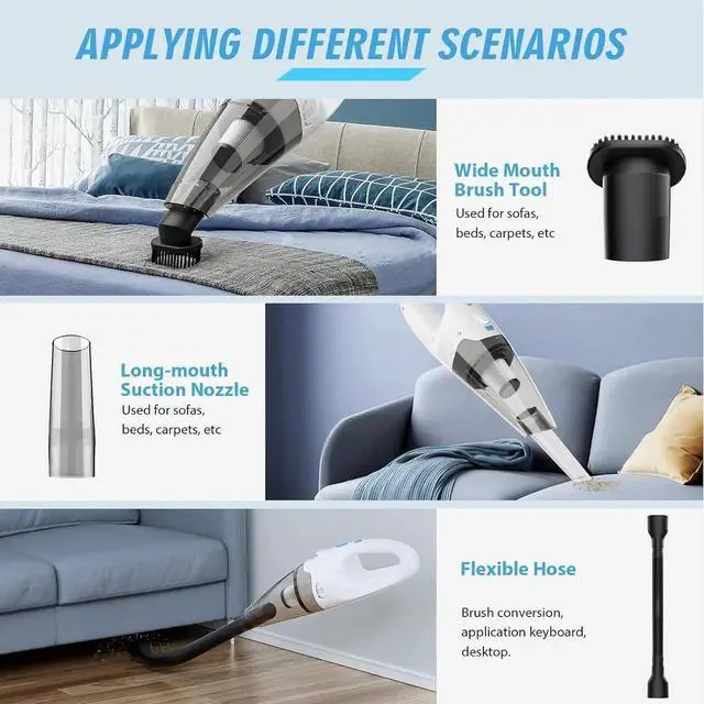 Multi-functional AttachmentThe portable car vacuum cleaner gives you three cleaning accessories. The hose and transparent clear crevice tool for stairs, corners, car seats and hard-to-reach spaces. The brush can can loosen the hair and dust stuck on the objects for better cleaning and dusting of carpets and sofas.