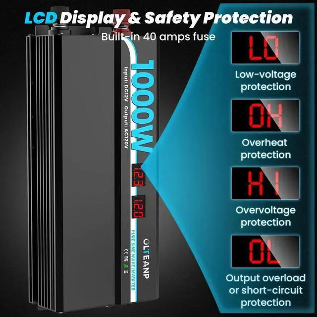 - LCD DISPLAY MASTER THE INVERTER WORKING STATUS- You can get troubleshooting from the LCD display to adjust the inverter and your battery. It will show the LO (low voltage protection), OH (over heat protection), HI (over voltage protection), OL(output overload or short-circuit protection). Control the inverter status easily.