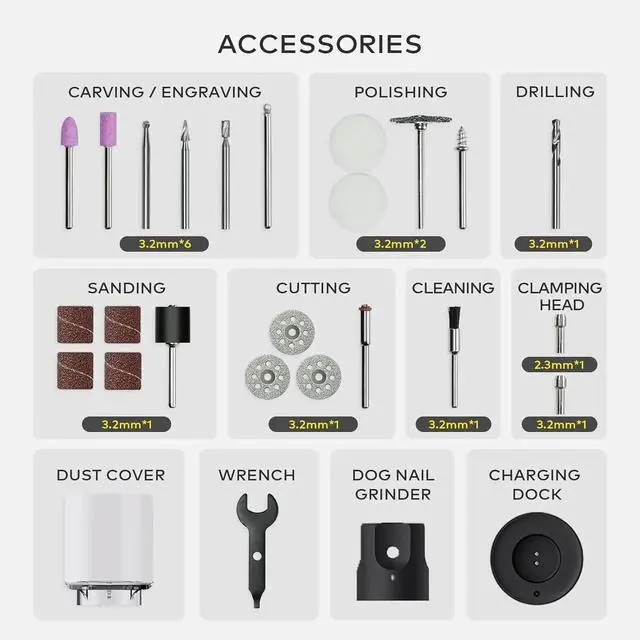 - DOG NAIL GRINDER & VERSATILE ACCESSORIES: Comes with 35 versatile accessories and a convenient storage case, allowing you to tackle a wide range of tasks including sanding, cutting, engraving, polishing, and dog nail grinder for your pet