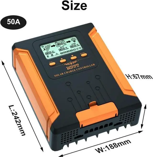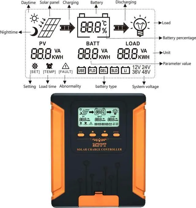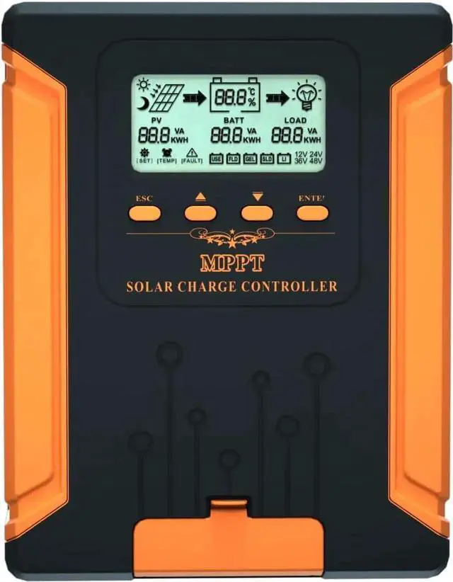Advanced Tracking TechnologyWith a built-in maximum power point tracking algorithm, this solar controller can significantly improve the energy utilization efficiency of photovoltaic systems and increase charging efficiency by 15% to 20% compared to the conventional PWM method. It combines multiple algorithms to track the optimum working point accurately. The maximum tracking efficiency is up to 99.9%. The digital power supply ensures a peak conversion efficiency of up to 98%.falseSmart LCD DisplayThe LCD of this MPPT charge controller shows operational information, parameters, and fault icons. It allows users to customize the parameters according to actual needs and is equipped with 4 buttons to set parameters.falseAutomatic RecognitionSolar power controller automatically recognizes 12V/24V/36V/48V DC input system voltage. MPPT charger supports charging gel batteries, sealed batteries, open batteries, and customized ones, and can even charge 0V lithium-ion batteries.false