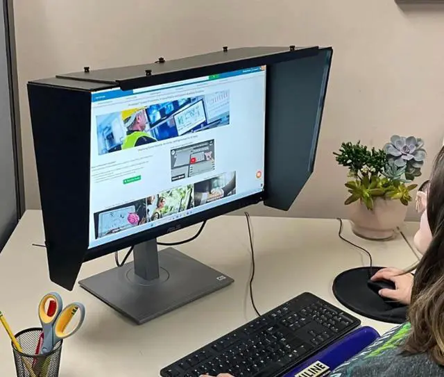Adjustable Office Monitor Hoods: These lightweight, fully assembled Adjustable Office Monitor Hoods are meticulously designed and built in-house. Constructed from high-density fiberboard with a neutral gray, light-absorbing interior, they create a shaded environment that dramatically reduces glare and blocks ambient light. This enhances both color perception and saturationmaking them ideal for gamers, developers, photographers, web designers, and anyone engaged in color-critical work. With an eight-inch visor depth, these hoods also provide effective privacy protection, shielding sensitive information from viewperfect for data entry professionals and medical environments. The hood folds flat for convenient storage and transport and installs easily with pre-attached elastic cords that secure it to the front of most LCD monitors between 29 and 34-inches wide. Designed for indoor use only, this model is not compatible with curved monitors.