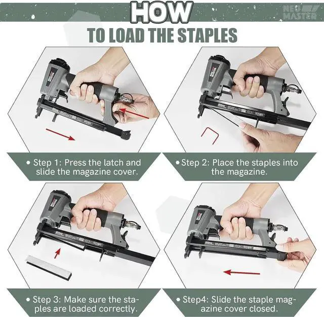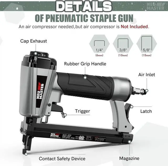 Product Overview Of Pneumatic Staple GunThe tool is great ideal for most heavy-duty projects, such as Wood working, Upholstery Installation, Interior/exterior Trim, Flooring, Roofing, Paneling, Staircases, Molding, Picture framing, Door and Window projects, Pet house etc.
