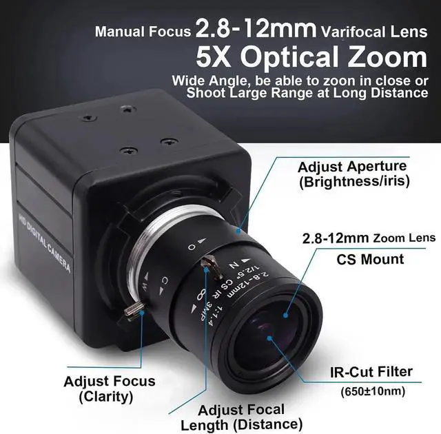 - 2.8 -12mm Zoom Lens: CS Mount high quality 5X optical zoom lens, manual adjustments of focus, iris&focal length for wide use, you can easily focus in close or make long distance shots. UHD USB camera are widely use for machine vision, electric microscope, medical machine, VR camera, studio shooting and regular home and industrial area