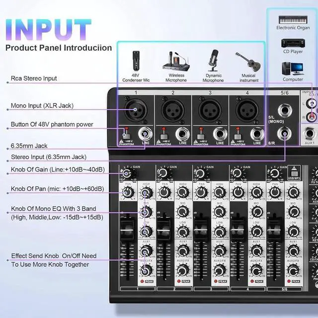 flash drive or Bluetooth device to mix and record. After pressing the MENU button, Use the built-in controls to play/pause, skip tracks and switch between modes. 3 Band EQ/16DSP Effects ProcessorEasily adjust the high Mid and low frequencies of each channel with the onboard 3-band EQ and gain controls. Independent Adjustment Faders Include Single Audio Input Channel, Total Audio Output Volume Adjustment Fader And Effect Adjustment. USB Sound Mixer Has Built-In 16 Kinds Of Dsp Effects. You can even add delay or reverb effects in your mix. - Music Mixer BoardThe 6-channel Bluetooth mixer, built-in wireless Bluetooth, DSP reverberation effect, 3-band equalization adjustment, comes with USB interface, support U disk playback function.