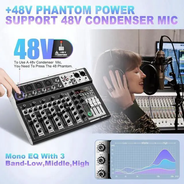 - 48V Phantom PowerThe sound mixer have 4 XLR inputs with phantom power. (If 1/2/3/4Channel Use 48v Condenser Microphone Need To Press +48v Button Phantom Poweryou can feel free to switch 48V phantom power and ultra-low noise distortion enables the audio mixer to be used with condenser microphone. this compact DJ Mixer will provide total dynamic control mixer is great for high quality on stage performance, live gigs and Karaoke.