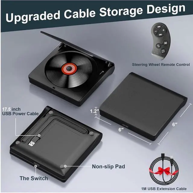 Hidden Cable Storage: Our portable cd player for car features an upgraded built-in storage compartment to neatly tuck away the USB cable when not in use. This space-saving design keeps your dashboard clean, prevents damage to the wires, and makes it easier to store the device. With a sleek, compact build, it fits seamlessly in your car, ensuring a tidy and organized setup.