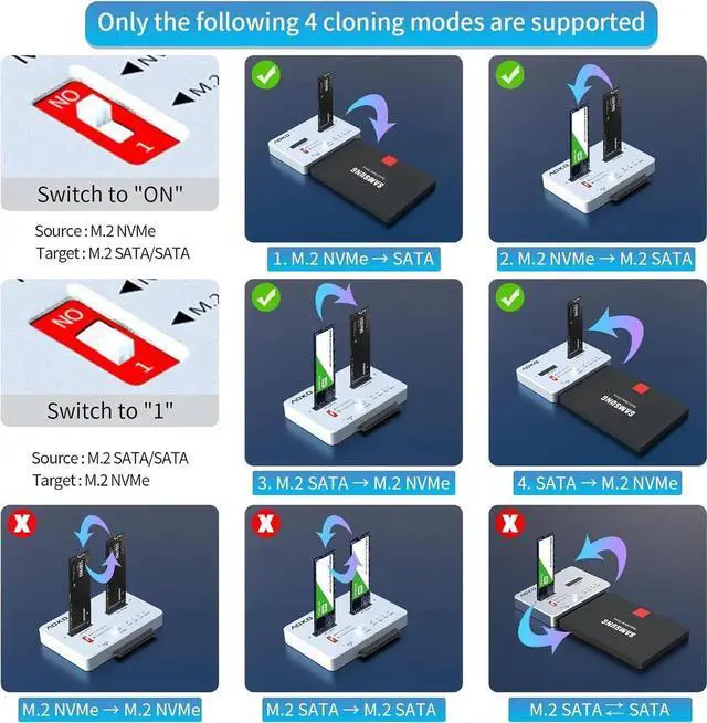 - AOKO M. 2 Hard Drive Cloner Support Multi-Clone Function (standalone OR via software clone); Supports Clone NVMe to M. 2 SATA; Clone NVMe to 2.5 or 3.5 SATA; Clone M. 2 SATA to NVMe; Clone 2.5 / 3.5 SATA to NVMe; So Easy conversion of various data fils