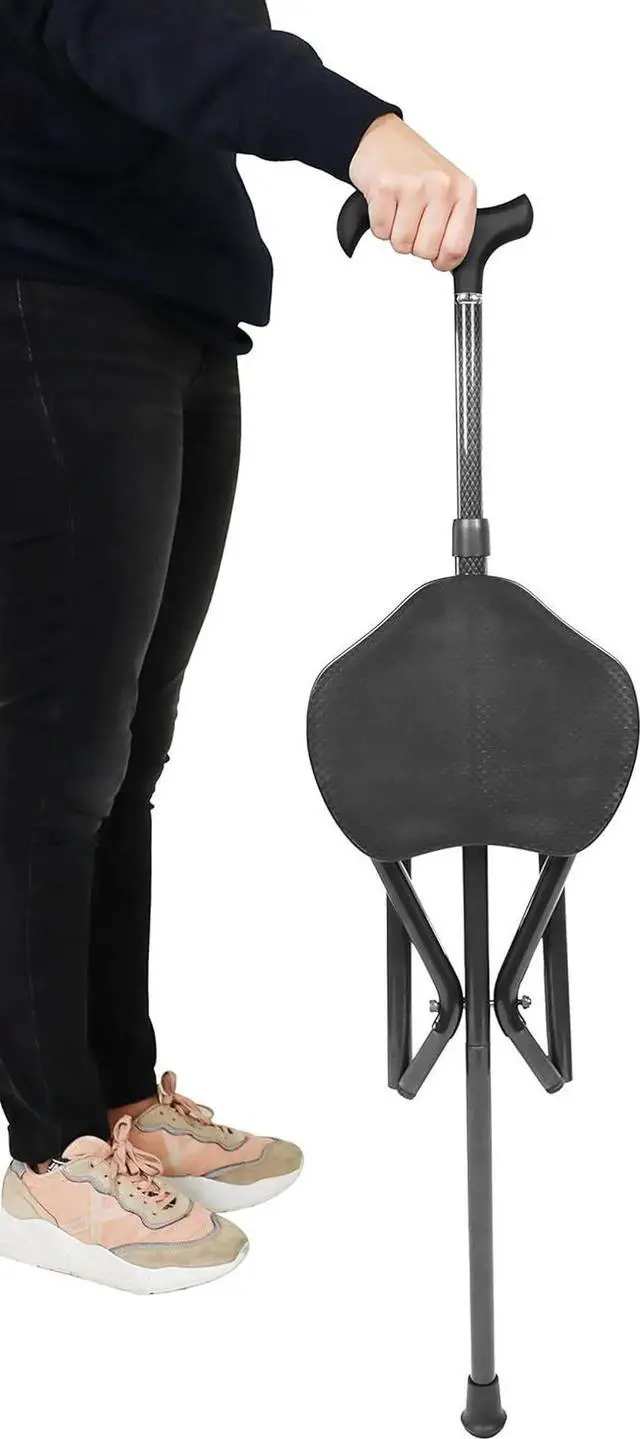 HIGH QUALITY: Made of carbon fiber, this walking stick with chair is lightweight ( 1.8 lbs) and tough, perfect for everyday use. Its high quality materials, the three-leg structure and its antislip ferrules give greater comfort and safety to the user when sitting down.