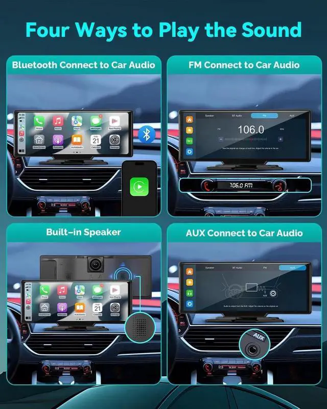 4 Audio Output Modes - Carplay box screen enhances your audio experience in multiple different output ways for superior sound quality, built-in speakers, Bluetooth, FM transmission or connecting AUX cable to your car speakers.