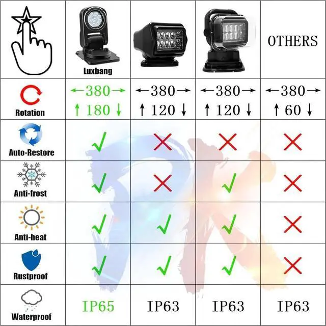 Dur ConstructionBuilt with premium ABS and alnum alloy, the remote control spotlight is designed to withstand harsh outdoor conditions and heavy-duty use