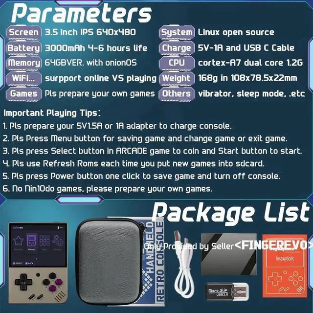 Package contents: 1*Miyoo Mini Plus Retro Gray-OnionOS-64, 1*Portable Case, 1*Screen Protector, 1*USB-C Cable, 1*TF-card Reader, 1*Instruction.