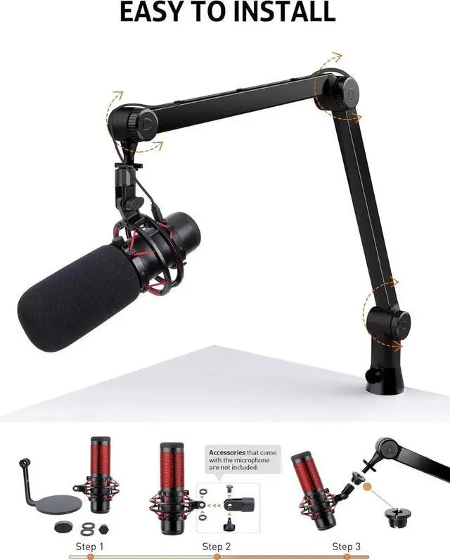 Package include - 1 x HyperX QuadCast boom arm, 1 x HyperX QuadCast foam cover, 1 x desk clamp, 1 x 3/8'' to 5/8'' adapter. If you meet any problem, please feel free to contact us, we will provide you with solution within 24H.