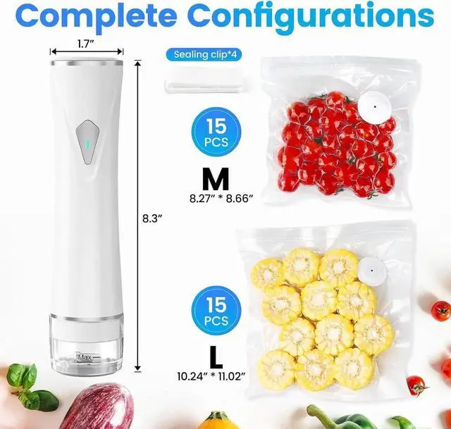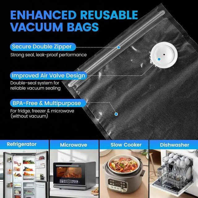 Food-Safe & Reusable Bags: Comes with 30 BPA-free, food-grade vacuum bags. Safe for freezing, boiling, and storing foods from - 11.2 to 212(-24°C to 100°C). Ideal for vegetables, fruits, meats, seafood, dry goods, leftovers, and moresaving space, money, and reducing waste.