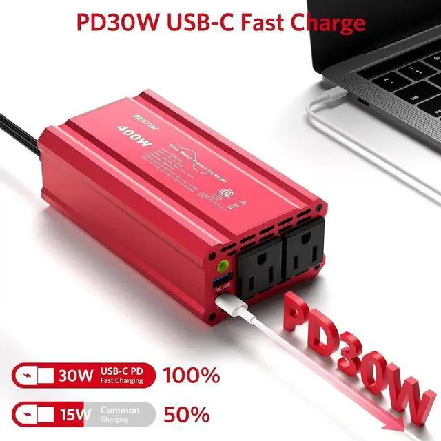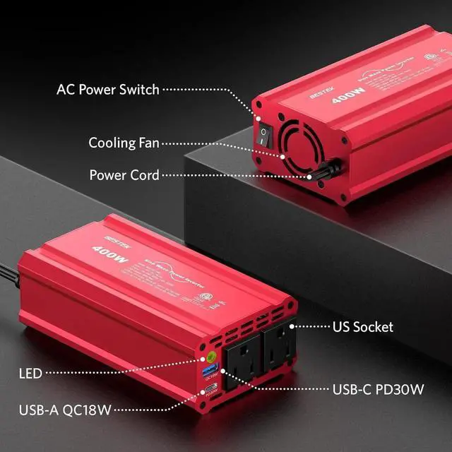 Climate Pledge Friendly Certified Product: This product has been awarded Climate Pledge Friendly certification. It is manufactured in an environmentally friendly factory using green photovoltaic energy throughout the entire production process, practicing the concept of sustainable development and being more environmentally friendly. - BESTEK 400W T-Type Sine Wave Car Power Inverter: Its output waveform is delivers a smoothly for sensitive electronics provided by the electric utility, Perfects for off-grid system, Lower THD, Less wear, Strong inductive Loads Capability. Its waveform features a flattened peak, so we call it a T-type sine wave. Recommended for most electrical devices to extend battery life.