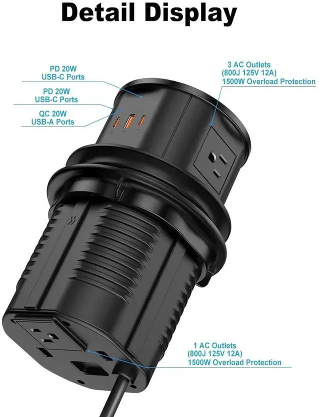 Countertop Pop Up Outlet 4 AC Outlets (12A/125V/1500W/800J), 2 PD 20W USB-C Ports & 1 QC 3.0 20W USB-C Ports, Multiple outlet and usb port better meet your need for devices.