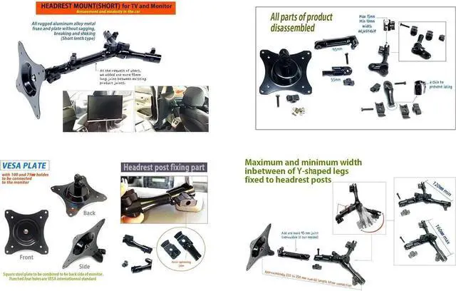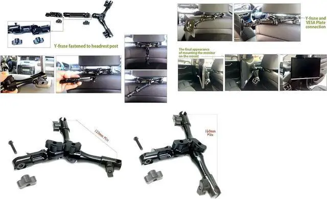Adjustable to fit any headrest poles with bar angle extension from 120mm to 160mm No tools required to fit the mounting bracket to the headrest