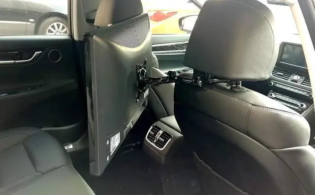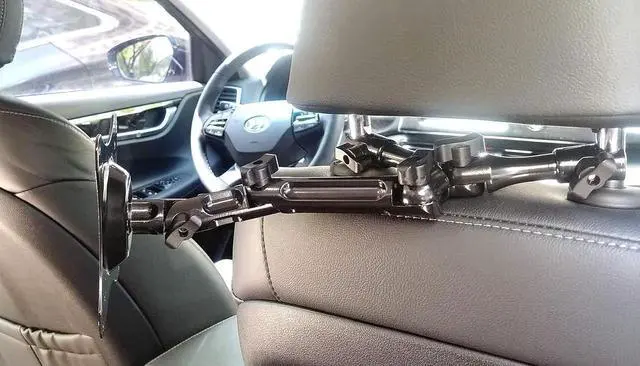 This headrest mount type monitor mount is a metal joint connection system that fixes the mount onto two posts of the headrest of the vehicle.