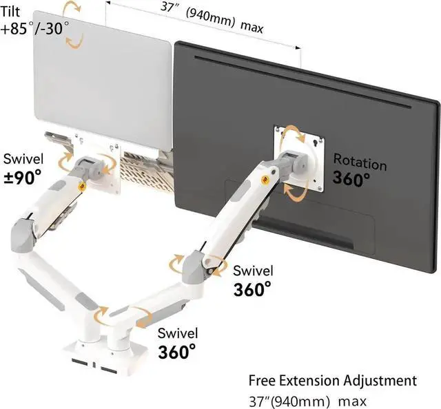 Organized Cable ManagementThe cable clips on the arms and center pole will keep your desk clean and organized. You can relax and enjoy working, gaming, or watching in a more comfortable environment. Organized cable management free up more space of working areamaking the desk tidy.