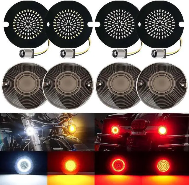 SWITCHBACK MODE - Higher indensity design, Brake & Turn Signal & Tail Light Combo Light Kit. The front bulbs are halo effect turn signal, outer halo white for running light and center amber for turn signal. The rear integrated tail light with brake light and runninglight, full red for brake light, outer halo red for running light. It can light up the road makes you to be more noticeable when you ride in dark.