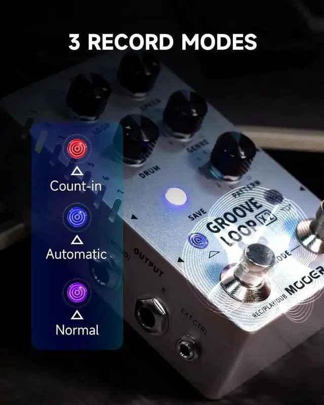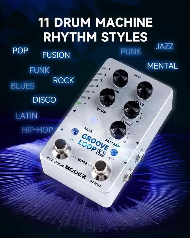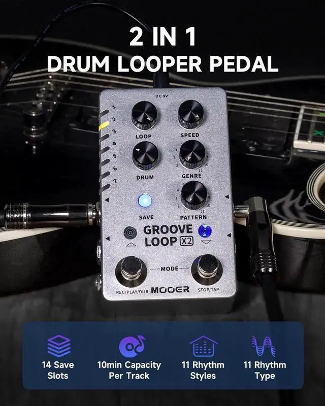 The TIME STRETCH function allows users to change playback speed without pitch changes, while separate outputs can be used for audio playback and drum machine soundsfalseThe Groove Loop X2 delivers a huge variety of drum grooves across 11 genres, with 11 variations easily selected using the included GENRE and PATTERN knobsfalseWith Tap Tempo functionality and automatic tempo detection while playing alongside the looper, the Groove Loop X2 is the must-have pedal for all your looping and drumming needsfalse- The Groove Loop X2 is the ultimate combo pedal, serving as both looper and drum machine - perfect for practice or live performances with 14 saves slots that store loops up to 10 minutes in length each