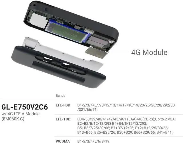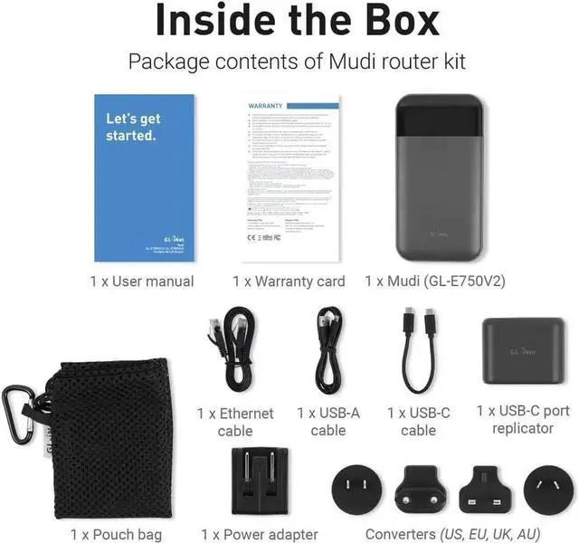 PACKAGE CONTENTSGL-E750V2 (Mudi) router with 2-year warranty, USB-C to USB-A cable, USB-C to USB-C cable, USB-C port replicator, Power adapter (US, EU, UK, AU Plugs), EM060K Cat6 4G module pre-installed, Ethernet cable, User manual.