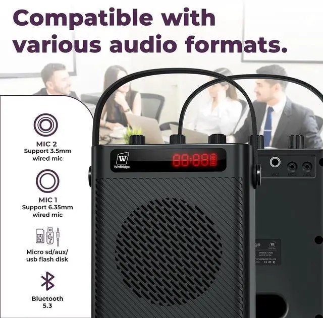 Whether you prefer a crisp and professional tone or a dynamic and immersive atmosphere, our product offers the tools you need to captivate your audience and deliver impactful content with confidencePortable Voice Amplifier - Our compact design, measuring 7* 5.9 * 3.7 in(18*15* 9.5 cm) inches and weighing 2.6 pounds( 1.2 kg), ensures easy transport and setup of your voice amplifier, empowering teachers to deliver clear and impactful lessons anywhere with convenience and ease- Powerful 40W Output - The voice amplifier features a robust 40W power output, guaranteeing clear and impactful sound projection in classrooms.