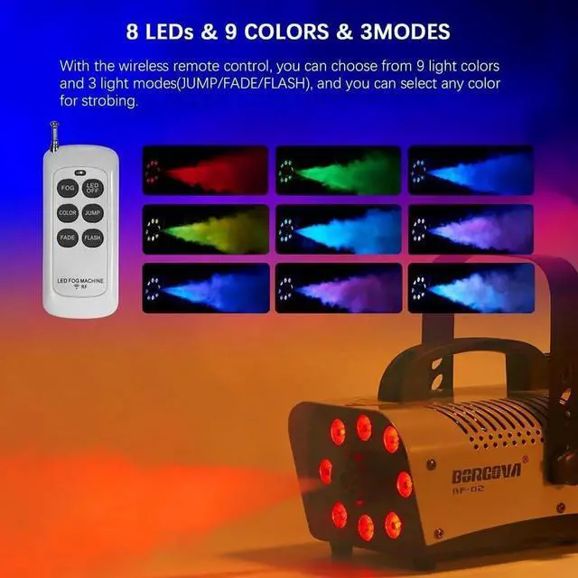 - Smoke Machine with Par LightsThis smoke machine is equipped with 8 RGBW 1-watt LED par lights, offering 9 colors and 3 lighting modes (Fade, Jump, Flash). It provides color strobe options, unlike other machines that only offer white strobe. When the smoke function is turned off, it can be used as a perfect stage par light