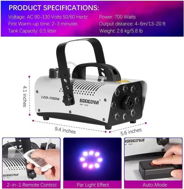 Easy to UseThe wireless remote control allows you to manage both the smoke and lights. Additionally, it includes a 5-foot manual controller for convenient operation. Press the auto mode button on the manual controller to enable automatic preheating and smoke emissionfalseSafe, Stylish & DurableWith 2 temperature controllers, it safeguards against overheating. Its sleek design promotes efficient cooling. Compact, rugged and portablefalseVersatile UsageThis powerful smoke machine is perfect for indoor and outdoor parties, Halloween, Christmas, and stage performancesfalse- High OutputThis 700W fog machine can produce a greater volume of fog, generating approximately 3000 CFM (cubic feet per minute) of non-toxic fog with each burst, quickly filling a 200 square foot room with a dense and atmospheric fog