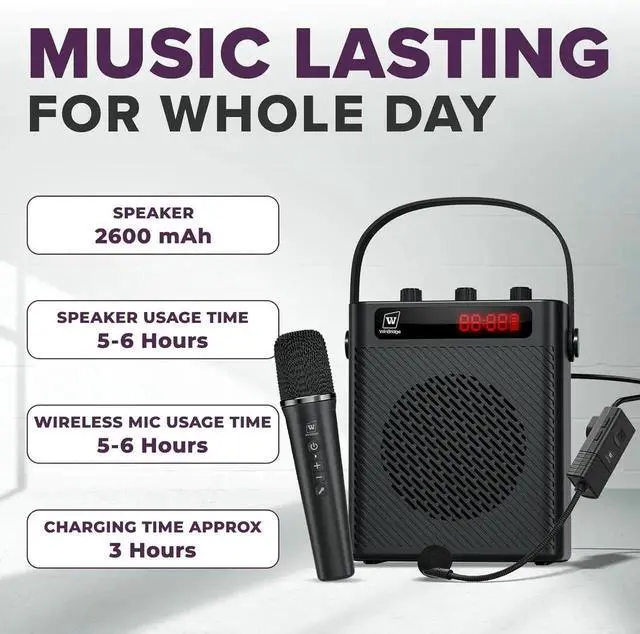- Rechargeable Voice Amplifier for Extended Teaching - Enjoy over 8 hours of continuous amplified voice with our built-in battery, ideal for long teaching days. The UHF wireless microphone delivers 5-7 hours per full charge, ensuring teachers stay wirelessly amplified for extended periods. Both the amplifier and microphone fully recharge in approximately 3 hours using the included power adapter. With dependable all-day battery life and quick recharging, teachers can confidently rely on this amplifier throughout their lessons.
