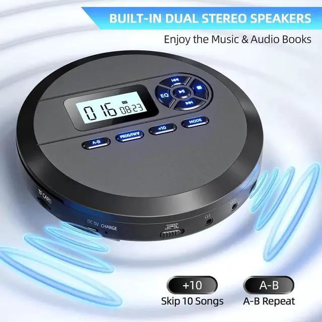 Anti-Skip and Backlight DisplayMusic CD player with anti-skip function ensure uninterrupted playing even when exercising or driving and let you listen the music smoothly. When this function work, the screen will show ASP and flashing. The LCD screen and buttons has the backlight design, so you can easily use it in the dark environment.