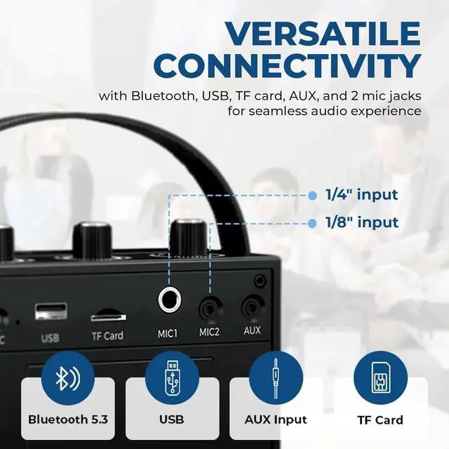 - Versatile Connection Options: Our wireless microphone and speaker features Bluetooth 5.3 for smooth streaming and stable transmission. bluetooth voice amplifier also supports a variety of connection options, including TF card, USB, AUX, and dual mic ports, making it compatible with a wide range of devices like smartphones, tablets, and laptops. This versatile system is perfect for music teachers, event hosts, public speakers, and fitness instructors who need to switch between different audio sources quickly and easily.